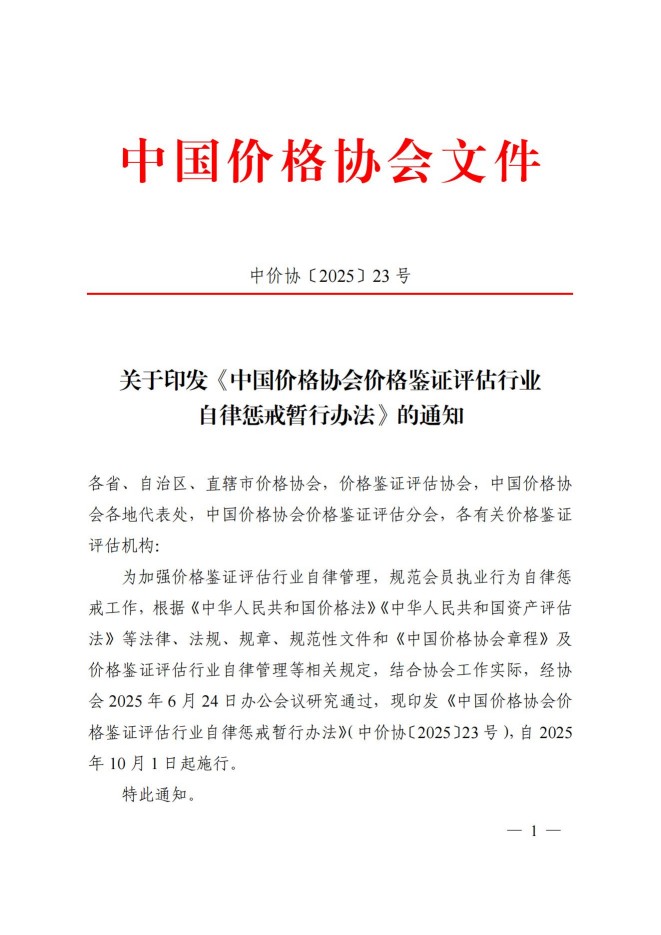 中价协【2025】23号关于印发《中国价格协会价格鉴证评估行业自律惩戒暂行办法》的通知