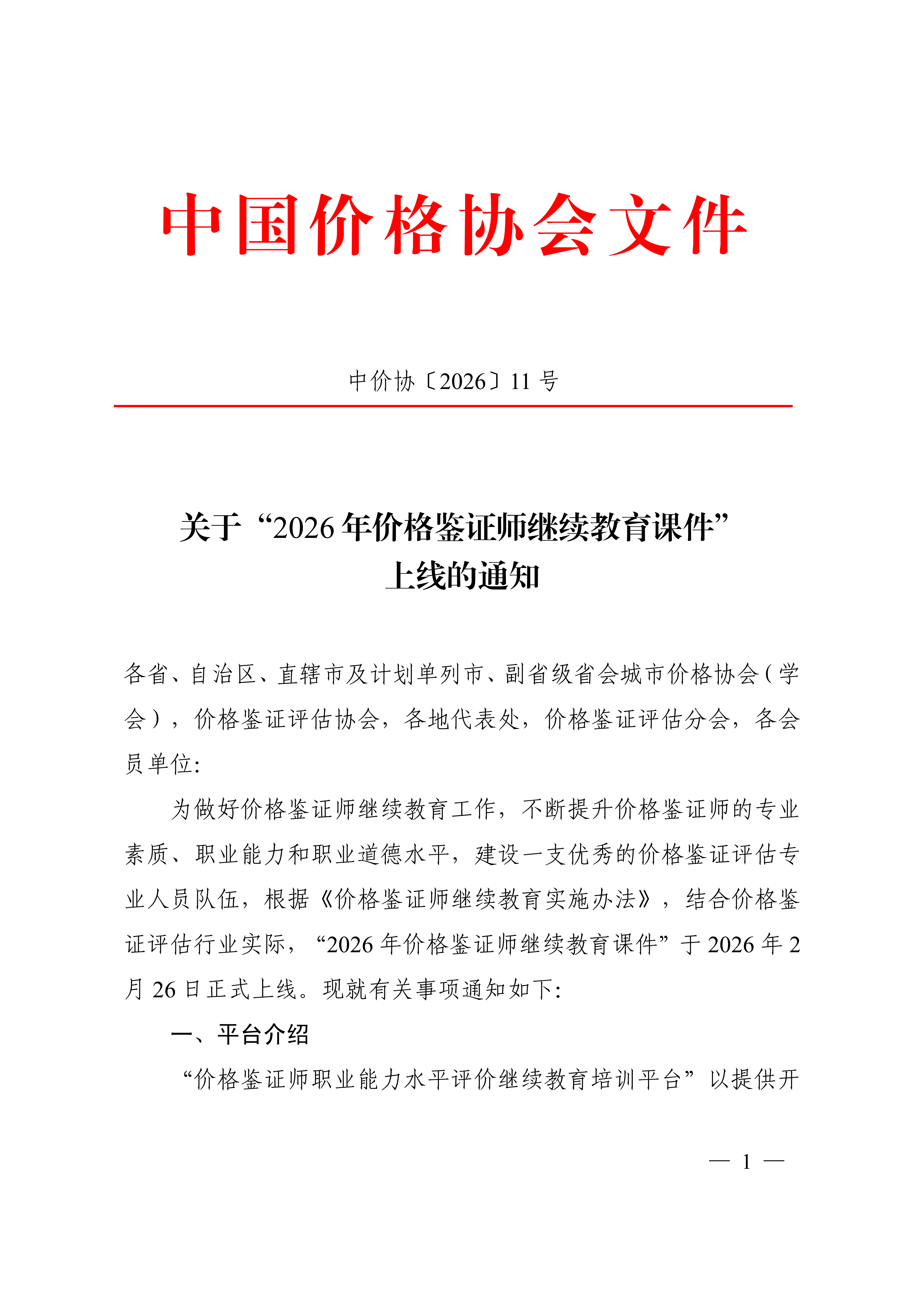 中价协〔2026〕11号 关于2026年价格鉴证师继续教育课件上线的通知