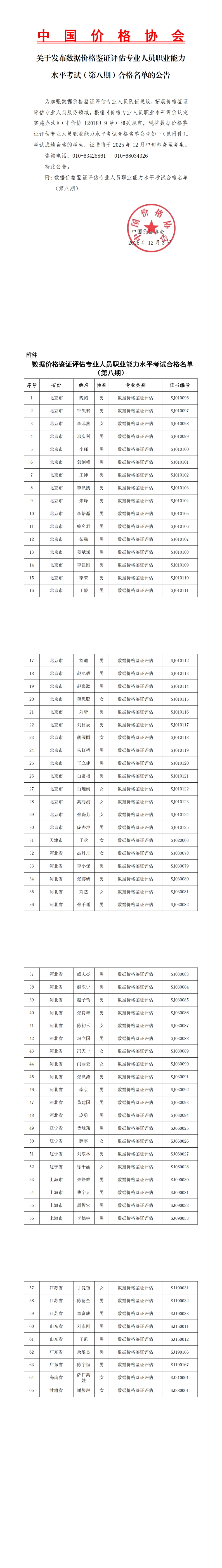 关于发布数据价格鉴证评估专业人员职业能力水平考试(第八期)合格名单的公告
